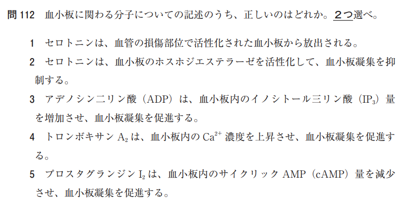 • 選択肢3:「ADPがIP3を増加させる」という記述が間違い。正しくは「サイクリックAMPを減少させる」。ここでは、凝集促進という作用は合っていますが、その機序が問われています。