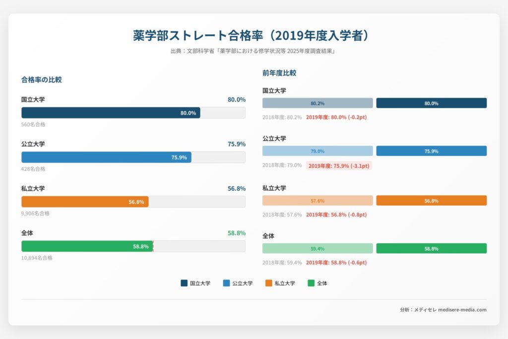 この記事では、文部科学省「薬学部における修学状況等」2025年度調査結果(2026年1月19日更新版)のデータをもとに、2019年度入学者のストレート合格率を大学別に分析します。
