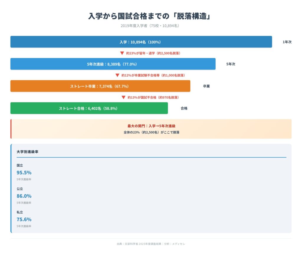 全体の約6割がストレートで合格している一方、残り約4割は留年・退学・国試不合格のいずれかを経験しています。